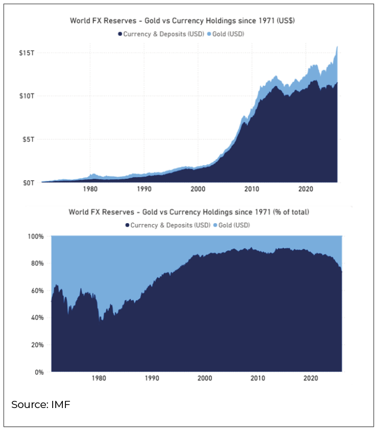 Many central banks still hold large allocations to USD assets, gold offers a way to reduce reliance on any single issuer, legal jurisdiction, or settlement network, without needing to “pick” another currency bloc.