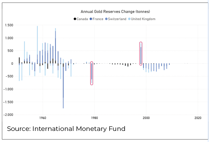 Part of the apparent late-1990s shift in some European gold reserve series reflects the unwinding of ECU-era swaps, not a sudden wave of physical purchases. This is highlighted below with the start and end of ECU system (bar circled in red).