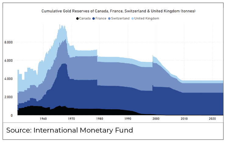 Canada illustrates the extreme endpoint of the “gold is unnecessary” philosophy. Today, Canada’s gold holdings stood at 0 tonnes of gold; The selling started in the end of 1980s bringing the reserves to insignificant levels by early 2000s.