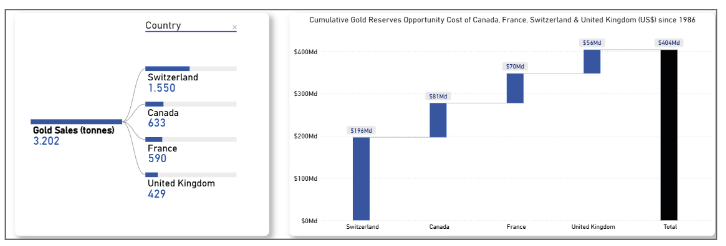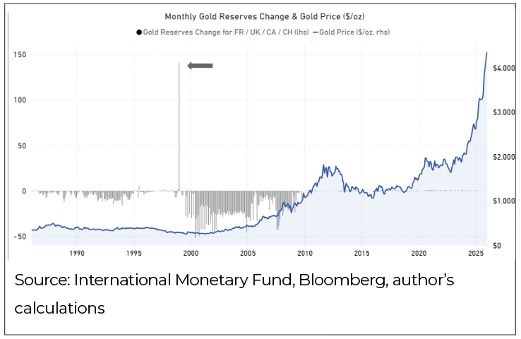 Reserve management is a long-duration decision. When a country sells a strategic reserve asset in size, it is not simply reducing volatility in a quarterly portfolio report; it is choosing a path through future regime uncertainty. And when the regime changes, as it did after the late 1990s, the difference between holding and selling can become visible on the scale of hundreds of billions. Thanks to publicly available gold reserves numbers, we calculated the opportunity cost coming from the untimely sales of gold reserves by France, Canada, Switzerland and the UK. (From 1986 to October 2025):