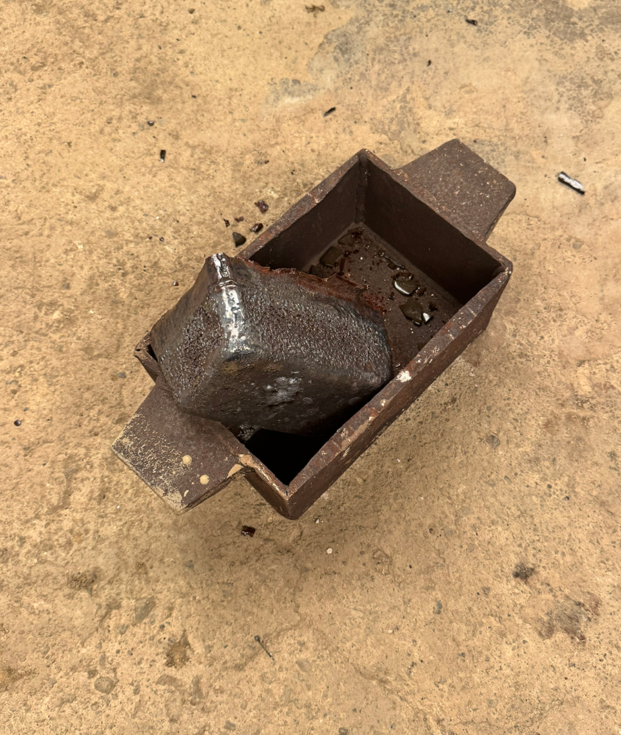 A refinery worker hands a doré bar to Laurent Mathiot after the smelting process is completed.