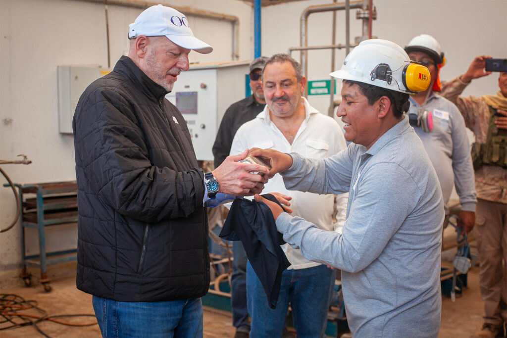 Laurent Mathiot and Ivan Salas are welcomed aboard the Yacari plant by the local team.